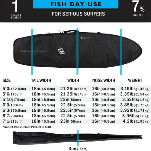DT2.0 Fish Day Use Boardcovers are designed for day-to-day usage with a single board capacity for wider fun boards. DT2.0 Day Use Boardcovers use premium DIAMOND-TECH® materials and superior construction to ensure your boards get to the beach and back intact. This model is suitable for retro, fish and funboards.Â
