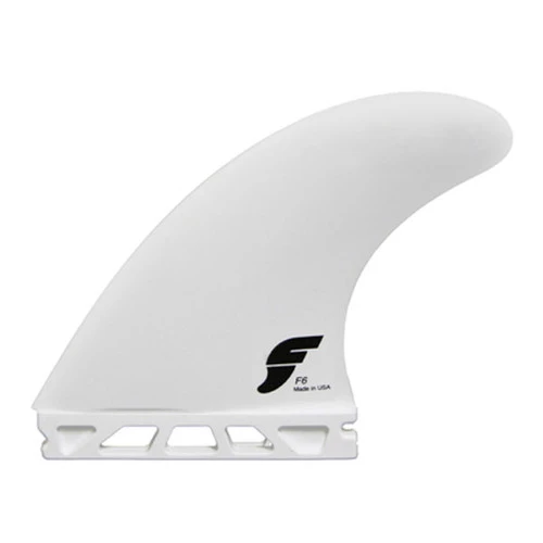 F6 Thermotech thruster fin template is designed to work for all surfers in all conditions. The solid base directly transfers power, while the tip is still flexible and resilient allowing it to bend and load up. The White Composite (Thermotech) fins have a consistent flex that hold great on the bottom, and then release through turns. If you’re looking for that glass on look, with a higher performance feel than other composites, then you have to try the F series from Futures. The F6 is a medium size template.