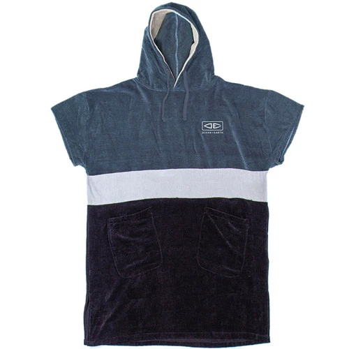 Men’s Strike Hooded Poncho black with grey and features a blue stripe. Hooded towel. Twin front pockets. Stay comfy and warm when changing at the beach, made from 340sm velour cotton. Feel good after being out in the elements & surfing when you jump into this warm, convenient surf poncho.
