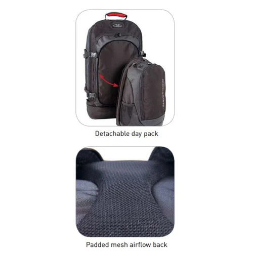 - Detachable daypack with padded laptop sleeve and mesh water bottle pockets